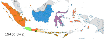 В основу деления страны на провинции, закрепленного в действующей конституции 1945 года, заложена система, принятая ещё голландской колониальной администрацией в начале XX века. К 1950 году Индонезия делилась на 10 провинций: Восточная Ява, Западная Ява, Калимантан, Малуку, Нуса-Тенгара, Северная Суматра, Сулавеси, Центральная Суматра, Центральная Ява и Южная Суматра. В том же году был образован особый округ Джокьякарта.