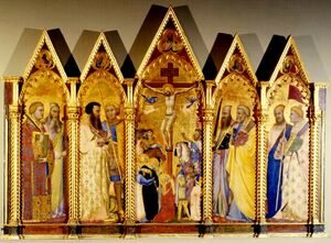 В готическую эпоху, особенно начиная с XIV века, алтарная картина претерпевает большие изменения — она принимает формы стрельчатой архитектуры, иногда ещё просто прямоугольной, но увенчанной «аркой в форме митры». Уже тогда появляются боковые створки, окружающие центральную картину. Так возник полиптих.