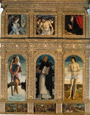 Полиптих (от греческого «poly» — много, и «ptychos» — складной) состоит из нескольких подвижных или неподвижных створок. Диптихом называют полиптих, состоящий из двух створок, триптихом — из трёх. Подвижные створки, закрывающие центральное панно, бывают, как правило, расписаны с двух сторон, одна из которых иногда расписывается в технике гризайль. Слово «пределла» (от ломбардского preti — скамья, или доска) обозначало сначала постамент, на котором стоит алтарь, а потом нижнюю часть самого алтаря.