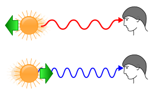 Движение звёздных объектов можно определить по их спектру. Из-за эффекта Доплера объекты, движущиеся к нам, смещаются в синюю сторону, а движущиеся от нас объекты — в красную. Длина волны света с красным смещением длиннее, и он кажется более красным, чем источник. И наоборот, длина волны света с синим смещением короче и кажется более синей, чем у исходного света: