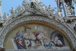 | Старейшая из мозаик фасада XIII века воссоздана в XIX А. Сальвиати. Изображает «Перенесение тела Святого Марка» после окончания строительства современной базилики. В ходе длительного строительства церкви мощи были спрятаны дожем и настоятелем собора во избежание их похищения. Тайник был утерян, а затем чудом открыт в пилястре базилики. | Мозаика Леопольда даль Поццо по картону художника Себастьяна Риччи, 1728—1729 годы. | Самая поздняя из мозаик собора, выполнена в 1836—1838 годы Либорио Саландри по картону художника Латтанцио Кверены | Неизвестный мозаичист по картону художника Пьетро делла Веккья, 1660 год. | Неизвестный мозаичист по картону художника Пьетро делла Веккья, 1660 год. Изображён досмотр сарацинами судна венецианских купцов в Александрии, для предотвращения обнаружения мощей венецианцы положили их в корзины и закрыли свиными тушами. |