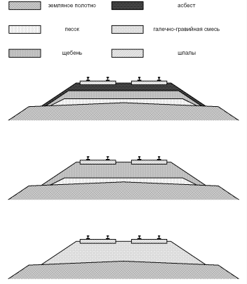 - трёхслойная — асбестовый балласт поверх щебёночной призмы на песчаной подушке.