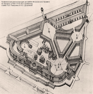 В 1768 году архитектор Василий Баженов предложил проект нового Кремлёвского дворца в классическом стиле, предусматривавший объединение части существующих построек. Так, корпуса нового комплекса должны были окружить колокольню Ивана Великого и отдельные строения Соборной площади[6][7]. При этом планировалось снести часть зданий XV—XVI веков, не учитывая историческую значимость объектов. Масштабный замысел Баженова соответствовал желанию Екатерины II убедить европейских союзников в состоятельности государства в преддверии Турецкой войны[8][9][10]. Благодаря такой реконструкции средневековая крепость должна была превратиться в уникальный архитектурный памятник, сравнимый с мифологическим Акрополем[11].