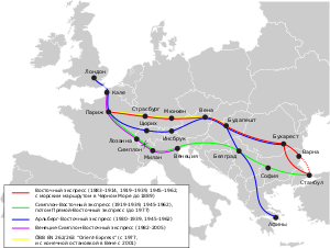 В это же время национальные железнодорожные управления начали вводить трансграничные скоростные поезда. Первый путь в 1867 году соединил Париж и Вену. При вечернем выезде из Парижа поездка занимала две ночи и один день[4]. Движение временно прекратилось в связи с Франко-прусской войной 1870—1871 годов. Маршрут, однако, остался востребован и стал первым соединением, на основе которого Нагельмакерс приступил к реализации своей идеи европейской люксовой сети поездов.