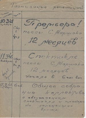 Из 32 архивных документов за период с декабря 1944 по май 1945 года режиссера драматического коллектива Леонида Константиновича Диковского удалось установить в хронологической последовательности: работу коллектива над постановкой, даты премьеры и последующих спектаклей (каждую субботу и воскресенье до 2 мая 1945 года), репетицию и постановку спектакля на радио (26, 27 марта 1945 года)[источник не указан 1407 дней].