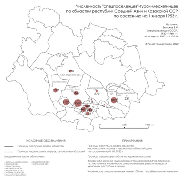 Всего было выселено 115,5 тыс. Депортированные месхетинские турки были рассредоточены по отдельным посёлкам в различных областях Узбекистана, Казахстана и Киргизии как «спецпоселенцы» (то есть без права изменения места жительства).