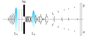 Дифракция Фраунгофера — случай дифракции, при которой дифракционная картина наблюдается на значительном расстоянии от отверстия или преграды. Расстояние должно быть таким, чтобы можно было пренебречь в выражении для разности фаз членами порядка [math]\displaystyle{ \frac{\rho^2}{z\lambda} }[/math], что сильно упрощает теоретическое рассмотрение явления. Здесь [math]\displaystyle{ z }[/math] — расстояние от отверстия или преграды до плоскости наблюдения, [math]\displaystyle{ \lambda }[/math] — длина волны излучения, а [math]\displaystyle{ \rho }[/math] — радиальная координата рассматриваемой точки в плоскости наблюдения в полярной системе координат. Иными словами, дифракция Фраунгофера наблюдается тогда, когда число зон Френеля [math]\displaystyle{ F \ll 1 }[/math], при этом приходящие в точку волны являются практически плоскими. При наблюдении данного вида дифракции изображение объекта не искажается и меняет только размер и положение в пространстве. В противоположность этому, при дифракции Френеля изображение меняет также свою форму и существенно искажается.
