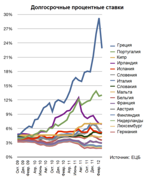 В первые несколько недель 2010 г. инвесторы вновь были обеспокоены величиной государственного долга европейских стран, что привело к дальнейшему повышению процентных ставок по государственным облигациям стран с наиболее высокими уровнями госдолга, бюджетного дефицита и дефицита текущего платёжного баланса. Это привело к тому, что привлечение средств для дальнейшего финансирования бюджетного дефицита и осуществления выплат по существующим задолженностям стало затруднительным для ряда стран, в случае низких темпов экономического роста и в тех случаях, когда значительная часть государственных облигаций находилась в руках иностранных кредиторов, как в Греции и Португалии[68].