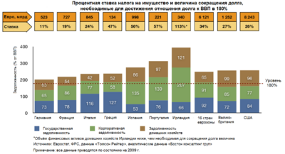 Согласно прогнозу Организации экономического сотрудничества и развития (ОЭСР), в 2010 г. 30 стран-членов ОЭСР получат от продажи государственных облигаций средства в размере $16 трлн. На выплаты по обязательствам стран еврозоны понадобится в общей сложности €1.6 трлн; ожидается, что в этот период в США будут выпущены ценные бумаги на сумму $1,7 триллионов[129], а в Японии будет необходимым продление сроков выплаты по государственным облигациям на сумму ¥213 трлн[130]. Греция стала ярким примером развитой страны, столкнувшейся с трудностями на финансовых рынках из-за повышения уровня государственной задолженности, но даже такие страны, как США, Германия и Великобритания пережили потенциально опасные моменты спада спроса инвесторов на облигации из-за обеспокоенности состоянием государственных финансов и экономики[131].
