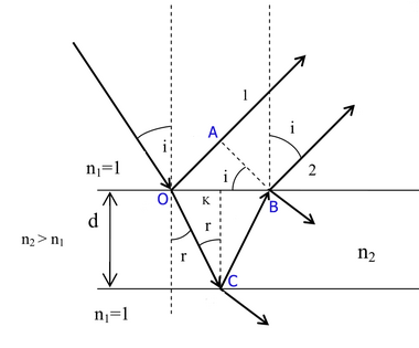 Луч света длиной волны [math]\displaystyle{ \lambda }[/math], распространяющийся в воздушной среде с показателем преломления [math]\displaystyle{ n_1=1 }[/math], при падении на поверхность плёнки с показателем преломления [math]\displaystyle{ n_2\gt n_1 }[/math] разделится на два луча. Часть отражается на верхней поверхности, а часть преломляется. Преломлённый луч достигает нижней границы, затем отражается от неё и, снова преломившись, выходит в воздушную среду когерентным с первым лучом. В силу условия когерентности двух лучей, наблюдается интерференционная картина, которая определяется оптической разностью хода между интерферирующими лучами: