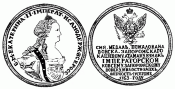 … Каждые полгода они выбирали военачальника, кошевого, который, отправившись в церковь, торжественно принимал знаки своего достоинства, получаемые им от русской государыни и состоявшие из особой шапки, булавы, пернача, трости и бунчука. …