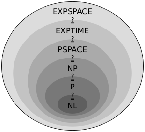 - P [math]\displaystyle{ \subseteq }[/math] NP [math]\displaystyle{ \subseteq }[/math] PSPACE [math]\displaystyle{ \subseteq }[/math] EXPTIME [math]\displaystyle{ \subseteq }[/math] NEXPTIME [math]\displaystyle{ \subseteq }[/math] EXPSPACE
