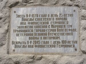 - На Мамаевом кургане в день 25-летия Победы заложена капсула с обращением участников войны к потомкам, которая должна быть вскрыта 9 мая 2045 года на 100-летие Победы[17].
