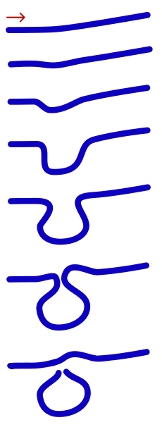 Как только канал начинает следовать по синусоидальному пути, амплитуда и вогнутость петель резко возрастают. Это происходит из-за эффекта спирального потока, который перемещает плотный эродированный материал к внутренней части изгиба и оставляет внешнюю часть изгиба незащищённой и уязвимой для ускоренной эрозии. Это устанавливает положительную обратную связь.