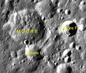 - Сателлитный кратер Мур F имеет систему лучей.