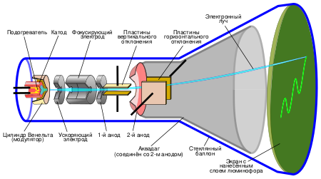 Осциллографическая ЭЛТ представляет собой вакуумированную стеклянную колбу, внутри которой находятся электронная пушка, отклоняющая система и люминесцентный экран. Электронная пушка предназначена для формирования узкого пучка электронов и его фокусировки на экран. Электроны испускаются катодом косвенного накала с подогревателем за счет явления термоэлектронной эмиссии. Интенсивность электронного пучка и, следовательно, яркость пятна на экране регулируется отрицательным относительно катода напряжением на управляющем электроде — модуляторе, выполненном в виде цилиндра Венельта. Первый анод служит для предварительного ускорения электронного пучка, второй и третий аноды — для последующего ускорения электронов и фокусировки. Управляющий электрод и система анодов образуют фокусирующую систему, эту систему формирования ускоренного электронного пучка обычно называют электронной пушкой. Последний из анодов электрически соединяется с проводящим слоем, нанесённым на внутреннюю коническую часть стеклянного баллона ЭЛТ — аквадагом. Аквадаг предназначен для сбора вторичных электронов, выбиваемых из экрана и электростатической экранировки электронно пучка от внешних электростатических полей.