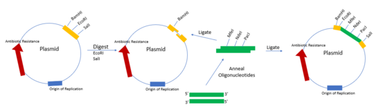 Использование плазмид в исследовательской деятельности огромно. Искусственные плазмиды активно используются в генетической инженерии в качестве векторов, в которые вставляются целевые кодирующие области[56]. Размножая такие плазмиды в бактериальных клетках, можно вырабатывать огромные количества нужного белка. Например, именно таким образом в настоящее время получают инсулин[57]. Искусственные плазмиды, которые предназначены для использования в качестве векторов, коммерчески доступны и всегда содержат ориджин репликации, гены, обеспечивающие устойчивость к некоторому антибиотику (для отбора на средах с антибиотиком бактериальных клеток, получивших плазмиду), а также несколько сайтов, распознаваемых разными рестриктазами. Вставку фрагмента осуществляют за счёт обработки рестриктазами плазмиды и фрагмента и последующего лигирования. В обычные векторы можно вставлять фрагменты до 15 килобаз длиной. Для клонирования более крупных фрагментов используют другие векторы, такие как космиды (плазмиды, содержащие локус cos бактериофага λ), фазмиды, также известные как фагемиды (плазмиды, содержащие ориджин репликации фага f1[англ.][58]), бактериальные и дрожжевые искусственные хромосомы[англ.][59].
