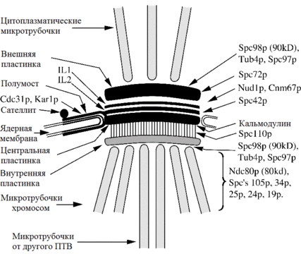 N-Конец Spc110 локализован во внутренней пластинке и связан непосредственно с Spc98, одним из двух похожих у-тубулин-связанных белков, необходимых для образования микротрубочек. С-Конец Spc42 обращен в цитоплазму и связан с С-концом Cnm67. Сходно с Spc110, спирально закрученный участок Cnm67 способствует его димеризации и функционированию между внутренними слоями IL2 и IL1. N-Конец белка Cnm67 связан с наружной пластиной ПТВ и белком Nudl, необходимым для выхода из митоза. Другой спирально закрученный белок Spc72 также обнаружен в наружной пластинке. Spc72 связан с Nudl и с компонентами γ-тубулинового комплекса.