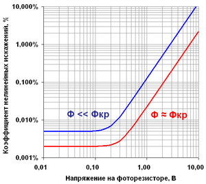 Нелинейные искажения, порождаемые фоторезистором, зависят от приложенного к нему напряжения и от освещённости. По данным PerkinElmer, КНИ для данного напряжения минимален при большой освещённости и малом сопротивлении фоторезистора. С уменьшением освещённости и ростом сопротивления КНИ увеличивается в несколько раз. Относительная разница между минимальным и максимальным значением КНИ для каждого типа фоторезистора практически не зависит от приложенного напряжения[61].