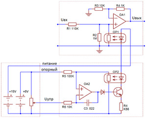 Наилучшее сочетание гладкой передаточной характеристики, малых искажений, большого диапазона регулировки и практически равных скоростей нарастания и уменьшения коэффициента передачи достигается в последовательно-параллельных схемах, составленных из двух оптопар и одного последовательного резистора[74]. Излучатели верхней и нижней РО в такой схеме запитываются комплементарными токами от диодно-резисторного делителя, подобранного под характеристики используемых оптопар. Частотные ограничения таких схем аналогичны последовательному включению РО[74].
