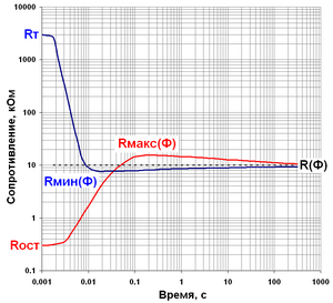 - RТ — темновое сопротивление (объёмное сопротивление кристалла CdS or CdSe) лежит в диапазоне от единиц МОм до сотен ГОм[2][45].