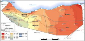 Температуры как правило, высокие в течение года, с максимумом от 36 °C до 38 °C в прибрежных районах. Сомалиленд имеет бимодальное распределение осадков. Первый основной сезон дождей, Гу, происходит в апреле и июне, а второй, Дейр, длится с августа по ноябрь. Два сухих сезона — это Джилал и Хагаа и происходят с декабря по март и с июля по август соответственно. В районах вокруг городов Шейх, Харгейса, Борама и Эригаво выпадает больше осадков. в среднем 400 мм в год. Северное побережье характеризуется низким уровнем осадков, составляющим меньше чем 100 мм в год. Остальная часть Сомалиленда получает годовое количество осадков от 200 до 300 мм.[3]