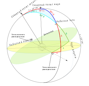 Основные элементы сферической астрономии — это системы координат и время. Для указания положения небесных тел используется экваториальная система координат, основанная на проекции экватора Земли на небесную сферу. Положение объекта определяется его прямым восхождением (α) и склонением (δ). На основе этих данных, широты и местного времени можно определить положение объекта в горизонтальной системе координат, а именно его высоту и азимут[1].