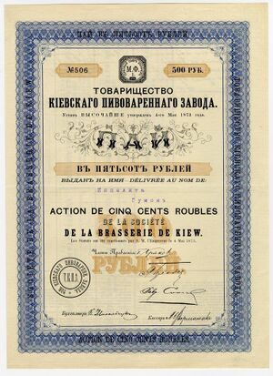 Как сказано в Высочайше утверждённом 4 мая 1873 г. Уставе Товарищества Киевского пивоваренного завода: "Для устройства и содержания пивоваренного завода в городе Киеве учреждается Товарищество на паях под вышеозначенным наименованием. Учредители: 1-й гильдии купцы: Ревельский – К. Вейсе. Киевский – Н. Хряков и швейцарские уроженцы: Г. Енни и Ф. Енни."[2]