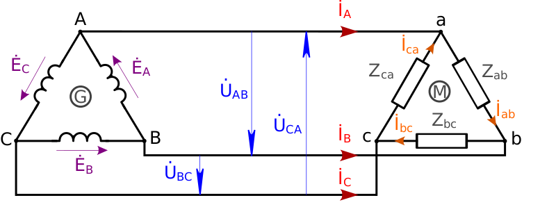 [math]\displaystyle{ I_L=\sqrt{3}\times{I_F}; \qquad U_L=U_F }[/math]