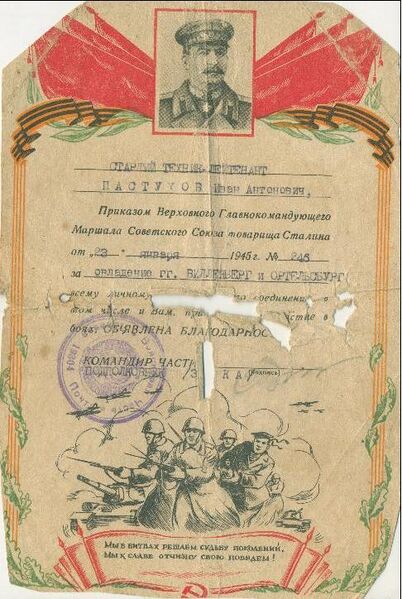 | Описание | Благодарность ВГК И.В.Сталина за взятие городов Вилленберг и Ортельсбург. |
