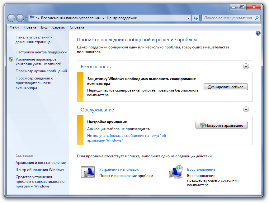 | Описание | Скриншот Центра поддержки в среде Windows 7 |