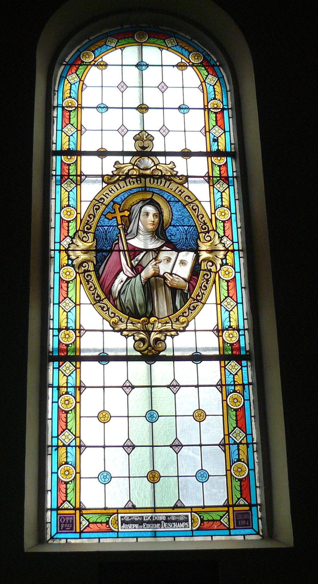 | Описание | Vitrail de Sainte Odile se trouvant dans l'église de Bassemberg. Don de Joseph et Eugène Deschamps, 1964 |