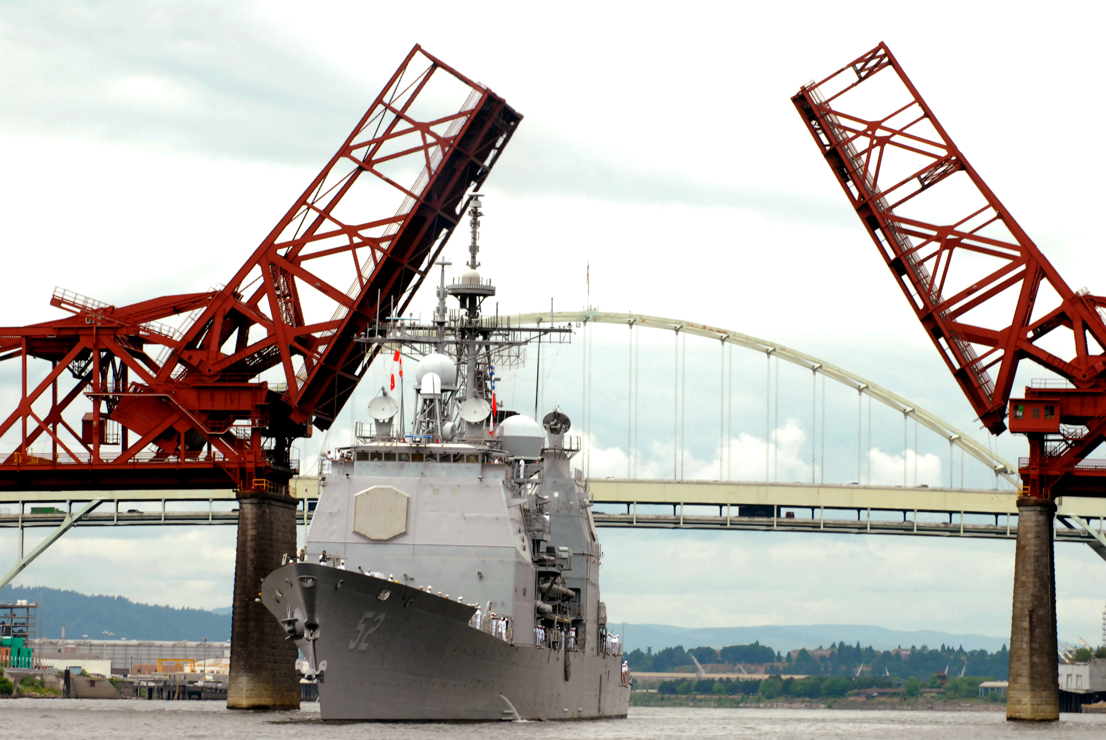 | Описание | WILLAMETTE RIVER (June 7, 2007) - The guided-missile cruiser USS Bunker Hill (CG-52) makes her way up the river and under the Broadway Bridge enroute to Portland, Oregon, to participate in the 100th Annual Rose Festival. Bunker Hill is just one of four U.S. Navy ships pulling into Portland for the 100th Annual Rose Festival Fleet Week Celebration. |