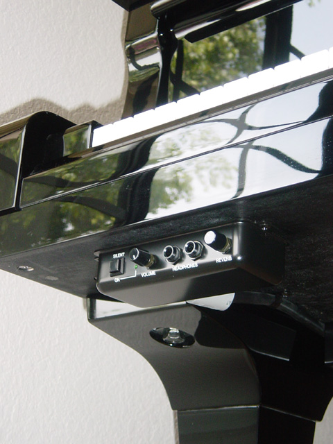 This picture (looking up from the floor) shows one component of the Yamaha Disklavier player piano. The unit mounted under the left side of the piano keyboard controls the audio output of the acoustic piano and the synthesizer. From left to right are: Silence button; silencer indicator; knob for volume control; two headphone sockets; knob for reverb control. When the silence button is pressed, the hammers will not hit the acoustic piano strings. The music will then be played by the synthesizer. The audio will come out on the two speakers under the piano, or the headphones if plugged in, or via the AUX line-out port to an external stereo sound system. Most components of the system are out of sight. Other components include a row of solenoids and optical sensors mounted behind each and every piano key, the synthesizer for other non-piano MIDI voices, amplifier and two speakers mounted under the sound board. |