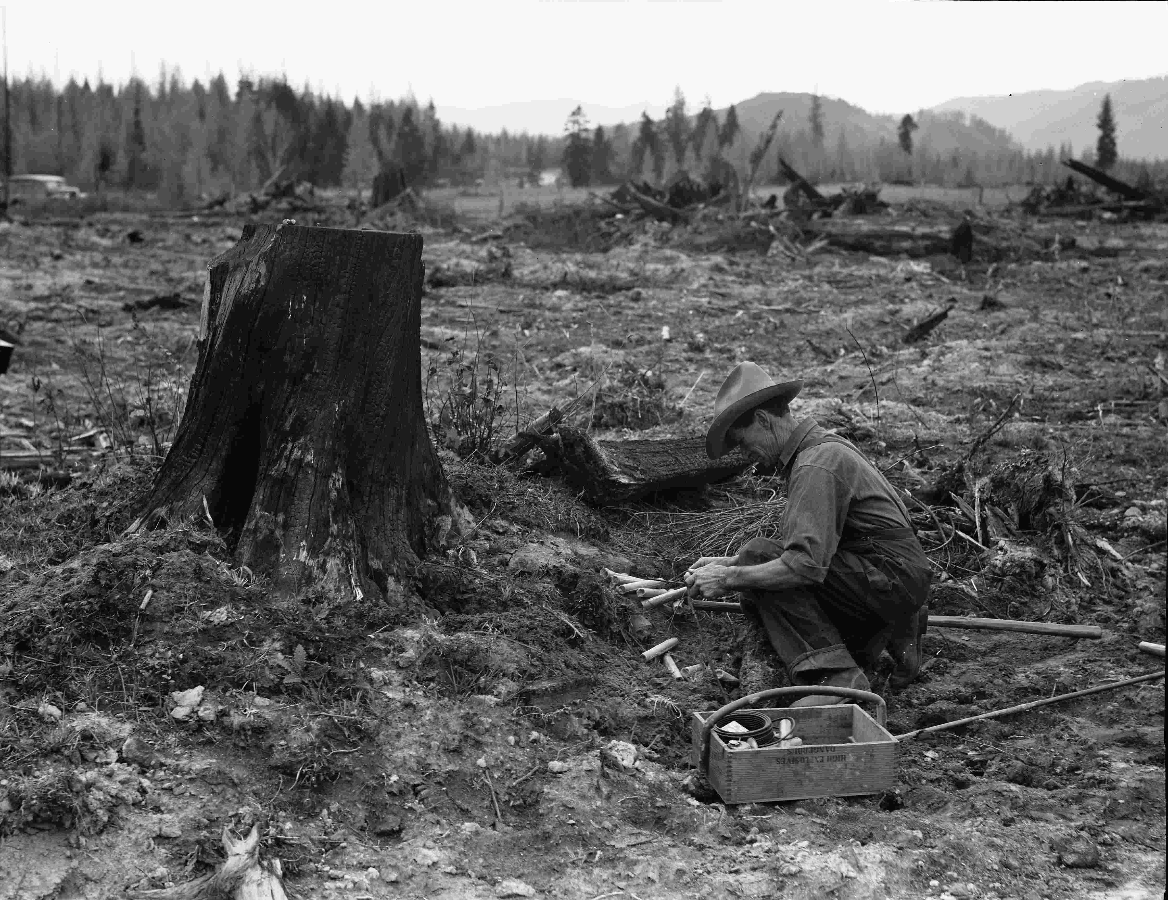 | Описание | Farmer preparing to blow tamarack stump. It will take fourteen sticks of dynamite. Bonner County, Idaho |
