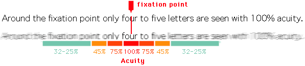 | Описание | This picture shows the acuity of foveal vision in reading (during one eye stop). The lower line of text simulates the acuity of vision with the relative acuity percentages. To do a test close one eye, fixate the upper line at the fixation point and try to read the words to the right and left without moving your eyes. The result should be similar to the incrementally blurred lower line of text - except that you never have the impression of a blurred text. The reason: Your visual perception is already the result of a massive computational analysis made by your brain. Your system "knows" that the upper line is not blurred, so you don't see it as blurred. But the difficulty of recognition increases with the distance from the fixation point. |
