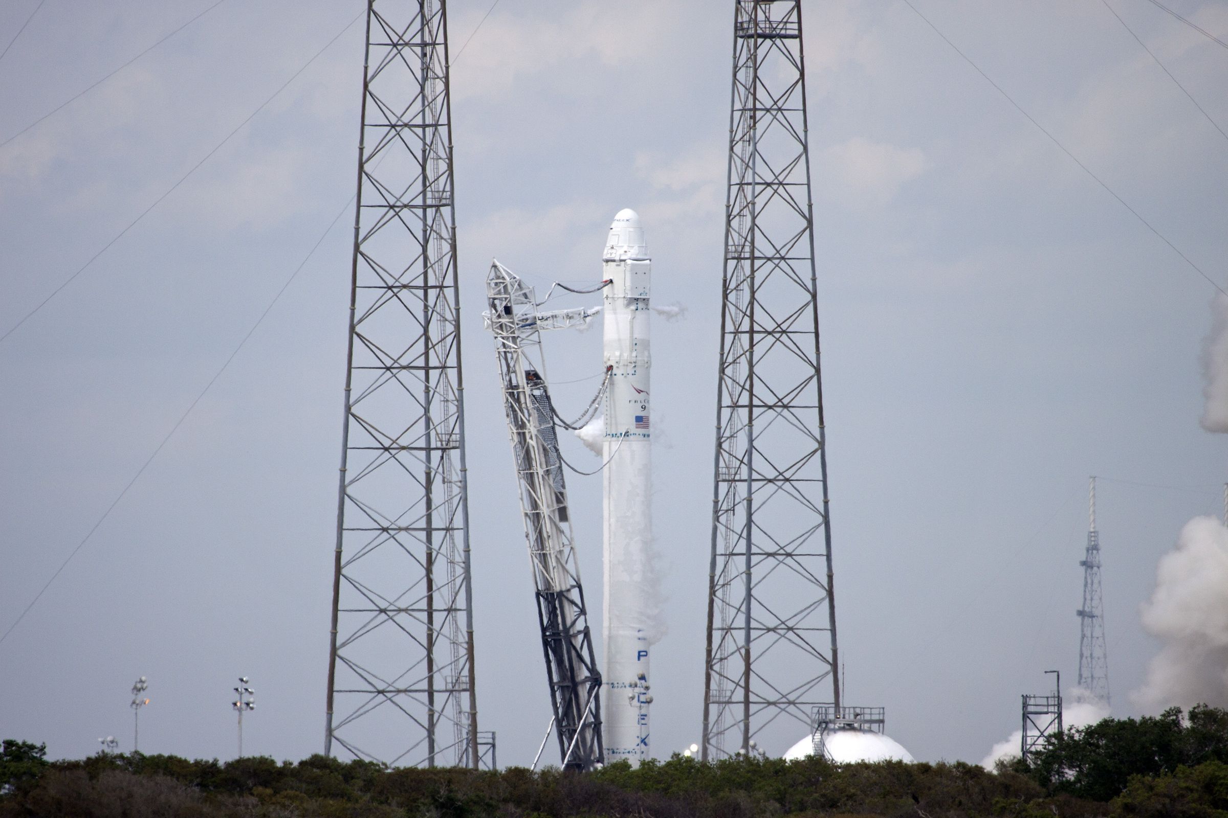 Файл:Falcon 9 during engine test fire for CRS-2 (KSC-2013-1687).jpg
