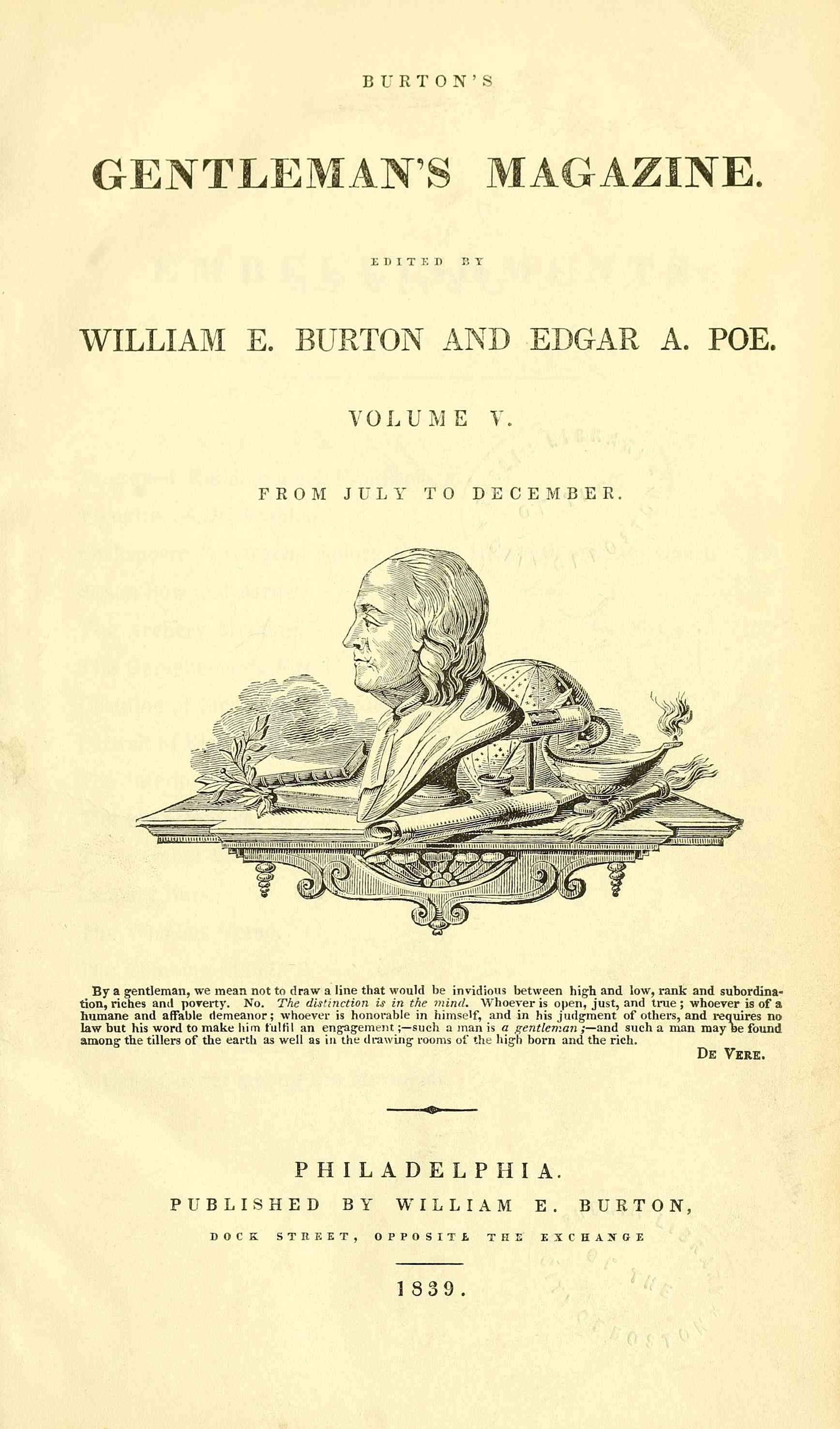 | Описание | Frontispiece for Volume 5 of Burton's Gentleman's Magazine with the names of both William E. Burton and Edgar A. Poe listed as editors |