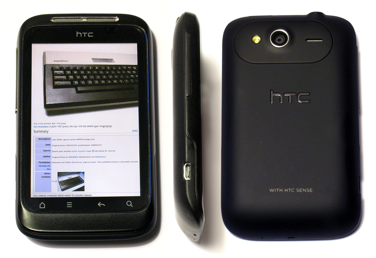 | Описание | HTC Wildfire S Android smartphone front, side and back views. (Front view shows part of Wikimedia Commons page for image of an Atari 800XL computer) |
