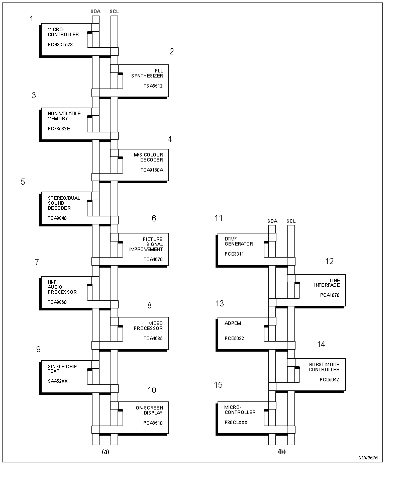 Пример схемы подключения микросхем к шине I²C для телевизора и радиотелефона.