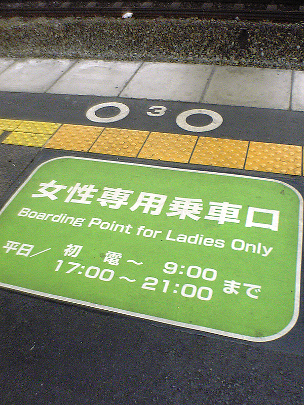 | Описание | A sign on a train boarding platform in Osaka, Japan, showing the boarding point for a ladies-only car. These cars have become neccesary due to high levels of groping in mixed cars. Two-thirds of women between the ages of 20 and 40 say they have been groped on the train in Japan. |