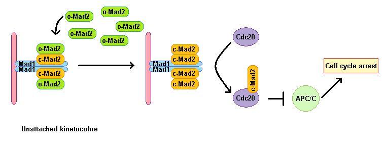 | Описание | MAD1 homodimer in unattached kinetochores is bound to two c-MAD2 and forms a catalytic receptor for cytozolic o-MAD2. Complex MAD1-cMAD2-oMAD2 catalyzes conformational change of inactive oMAD2 to the active c-MAD2 form. C-MAD2 then binds to Cdc20 and mediates APC/C inhibition and mitotic arrest. |