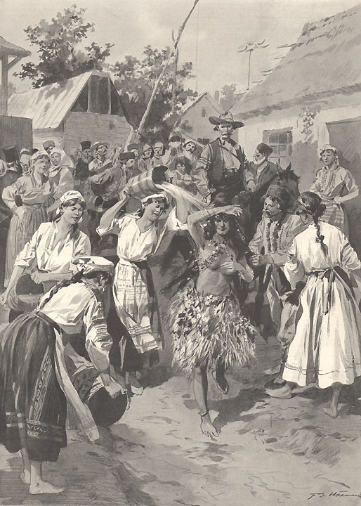 | Описание | The Graphic September 9, 1905 In times off severe drought, writes our correspondent, the Roumanian peasantry have recourse to a peculiar custom, the origin of which is unknowm, but is doubless some heathen rite. Gypsy girls, clad only in a short skirt, of corn, vine and small branches run through the villages, whilst the peasantry deluge them with water. The most curious part about the rite is that it is done in all seriousness, the onlookers dutifully crossing themselves as the Babarouda, as they are termed rush by, the recipients of douches from buckets or the wooden vessels so dear to the Roumanian peasant. The girls afterwards go round and collect as a reward for their trouble. As to the effiacy of these rain-makers, no reliable records are kept. RAIN GIRL The Baradouda or Paparuda. Roumanian custom of the Thursday following Easter. Rite of invocation RAIN GIRL La Baradouda or Paparuda. Roumanian custom of the Thursday following Easter. Rite of invocation of rain (peasants throw water on a young woman). Illustration by Frederic de HAENEN (1853-1928) for the English magazine The Graphic of September 9, 1905. reference |