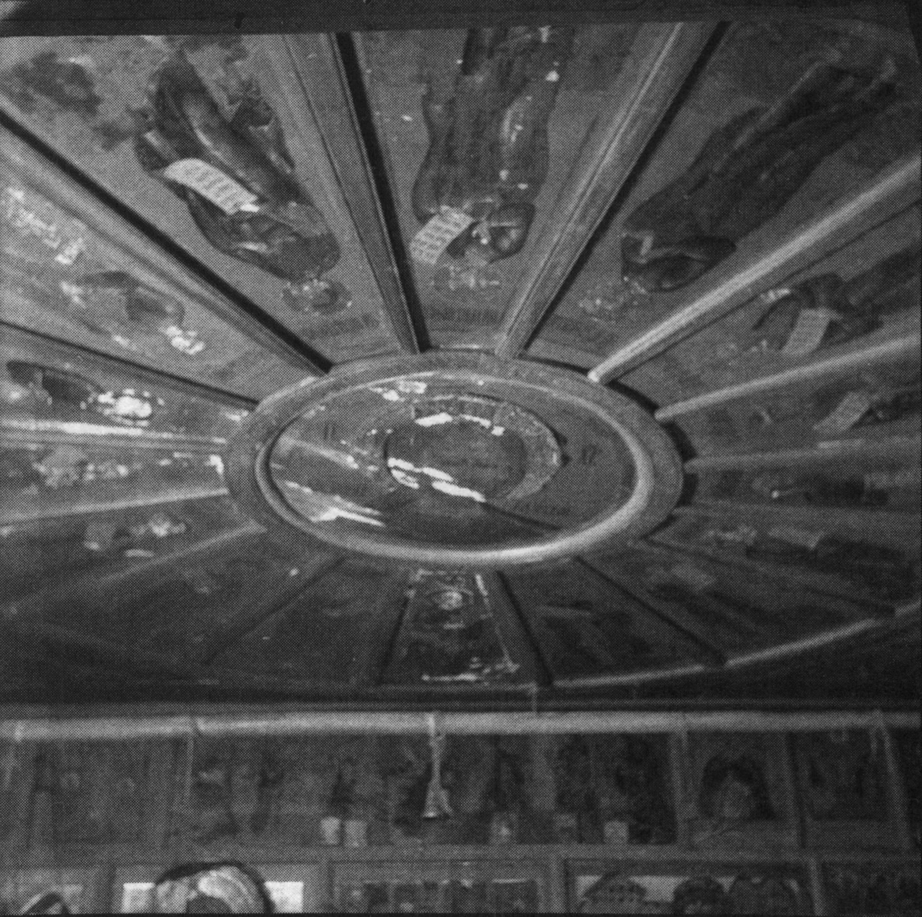 | Описание | Часовенская (Медвежьегорский район). Часовня великомученицы Варвары, роспись потолка над молитвенным помещением, вид от двери |