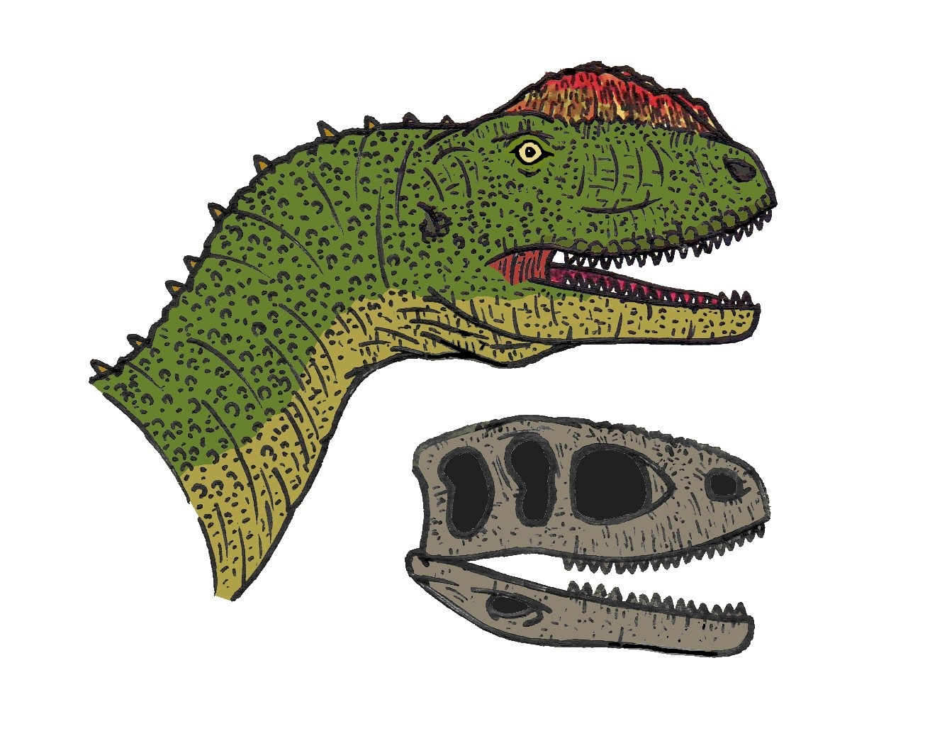 | Описание | Illustration of the skull from the theropod dinosaur Rugops primus, and version with flesh above. The crests on the snout is based on the holes found on the skull. The skull also had a lot of grooves ( maybe to conduct veins and bloodvessels ), and is belived to have been very fragile, especially compared with Majungasaurus and Tyrannosaurus rex. Because of this, scientists belive Rugops not could crush bone. It also had small teeth, even for an abelisaurid, and it maybe lived as a scavenger.