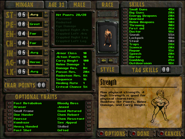 | Описание | Скриншот экрана создания персонажа в компьютерной игре Fallout 2 |