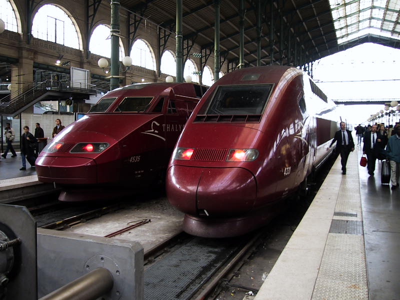| Описание | Thalys PBA (left) and Thalys PBKA (right) high-speed trains side-by-side in Paris Gare du nord station. |