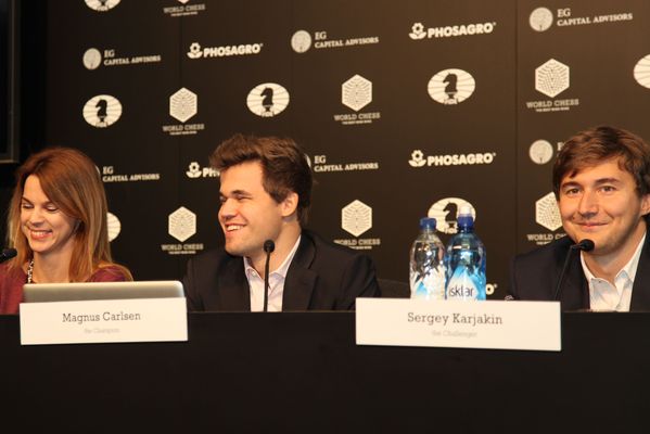 | Описание | Карлсен и Карякин на пресс-конференции после 12 партии матча за звание чемпиона мира по шахматам 2016 года |