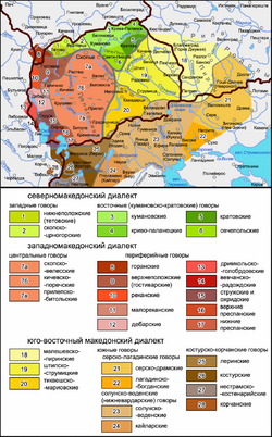 - ↑ Преглед на македонски дијалекти (со звучен запис на дијалектните текстови). Врз основа на трудовите на академик Божидар Видоески[макед.] (pdf, mp3) / подготвил М. Марковиќ. — Скопје: МАНУ. Центар за ареална линвистика. — С. 33 (Дијалектите на македонскиот јазик).