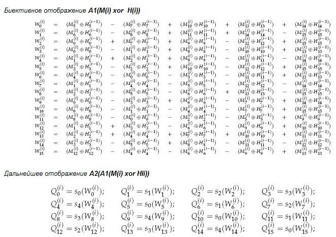 - Вторая функция F1 : {0,1}2m→{0,1}m. Она принимает в качестве аргументов блок сообщения M(i) (длины m бит) и первую часть учетверенной трубы Q(i, a). Результат записывается во вторую часть учетверенной трубы Q(i, b)=F1(M(i),Q(i, a)).